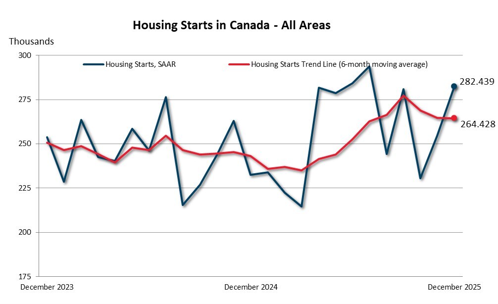 “While housing starts in 2025 finished ahead of 2024 and inched up in December, most of the momentum in housing construction occurred in the Spring and Summer. Since September, the trend in housing starts has consistently decreased. In 2025, economic uncertainty and the diminished viability of large residential towers encouraged a shift towards smaller-scale projects,” said Mathieu Laberge, chief economist and SVP, housing insights at CMHC.